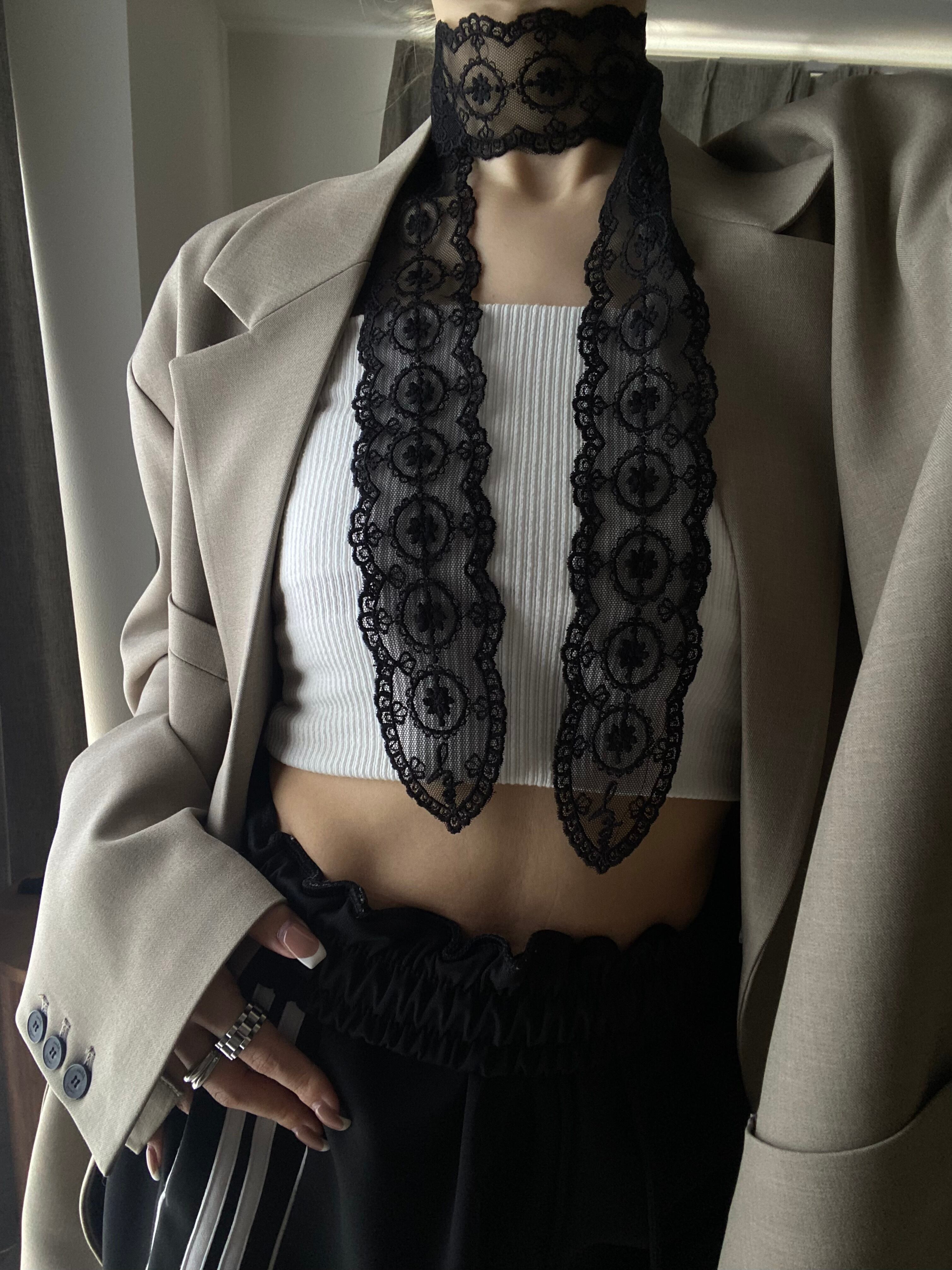ネクタイのような細身のシルエットが、モードで洗練された印象を演出します。
